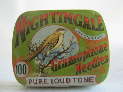 Title (ebay affiliate link): VINTAGE NIGHTINGALE GRAMOPHONE NEEDLES LITHOGRAPH METAL TIN BOX - VERY NICE! NR!
