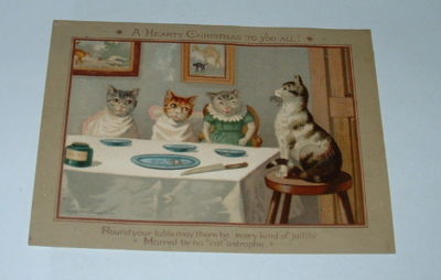 Title (ebay affiliate link): 1881 Victorian Christmas Card ~ Louis Prang ~ Cats At Dinner Table
