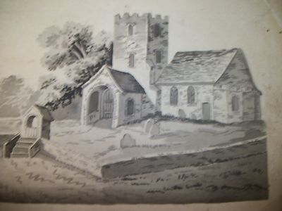 Title (ebay affiliate link): Antique Unsigned Medieval Church Town Hall w/ Clock Watercolor 18th c!