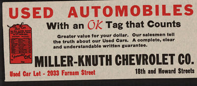 Vintage Chevrolet "OK TAG" Used Auto Blotter Large size OMAHA NE Miller Knuth