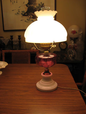 Title (ebay affiliate link): Vintage Cranberry Glass Thumbprint and White Milkglass GWTW Lamp 10" Globe