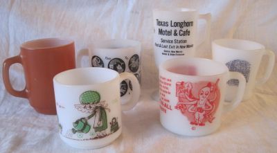 Title (ebay affiliate link): Milk Glass Mug Cup Lot Advert Currier Ives Fire King Anchor Hocking Daisy HA