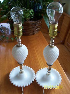 Title (ebay affiliate link): 2 VINTAGE WORKING MILK GLASS HOBNAIL SAUCER NIGHTSTAND TABLE BEDROOM LAMPS