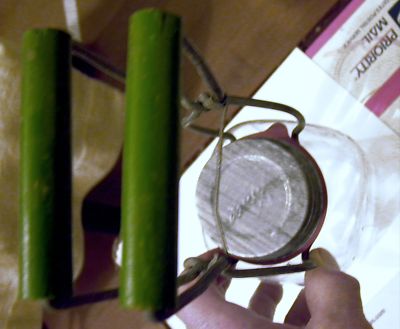 OLD KITCHEN TOOL,WOODEN GREEN HANDLE CANNIBG TOOL.BALL JAR 1/2 GALLON,ZINK LID