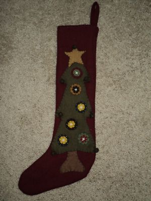 PRIMITIVE Wool Penny Rug CHRISTMAS Tree Burgundy STOCKING New!! Jingle bells