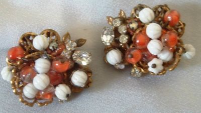 Vtg ROBERT Milk Glass RHINESTONE Clip On Earrings