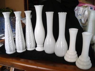 SET OF EIGHT MILK GLASS VASES ALL ARE NUMBERED