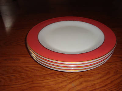 Set of 4 Pyrex Red/Gold Rimmed Dinner Plates Milk Glass