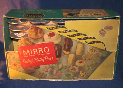 Title (ebay affiliate link): Antique Vintage Mirro Aluminum Cookie Press - WITH ORIGINAL BOX & INSTRUCTIONS