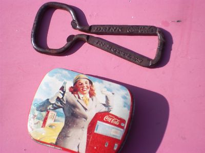 VINTAGE METAL COCA COLA COKE ANTIQUE OLD BOTTLE OPENER + TIN
