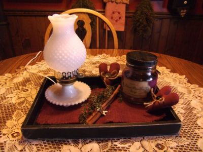 PRIMITIVE FARMHOUSE VALENTINE MILK HOB KNOB LAMP JAR LABEL TRAY GATHERING HEAT
