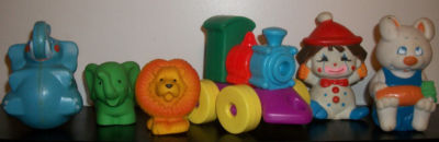 Title (ebay affiliate link): Vintage LOT AVON The First Years Baby Toys Train Clown Circus Animals Bunny 70s