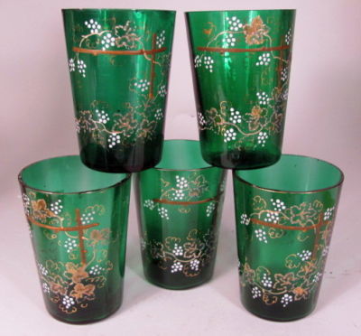 Title (ebay affiliate link): Five Antique Emerald Glass Enameled Tumblers w Gold Grapes Victorian