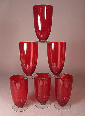 6 Elegant Era Ruby Glass Footed Water Tumblers Stems Glasses 1940s