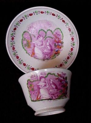 Title (ebay affiliate link): "The Play Fellow" PINK LUSTER CUP & SAUCER - GIRL & CAT pearlware - excellent