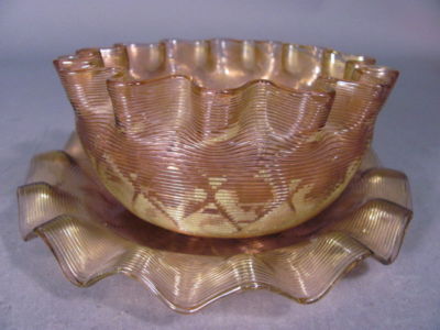 Victorian Cranberry Threaded Art Glass Ruffled Bowl & Liner E