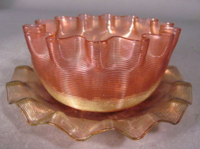 Victorian Cranberry Threaded Art Glass Ruffled Bowl & Liner F