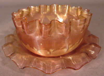 Victorian Cranberry Threaded Art Glass Ruffled Bowl & Liner D