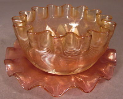 Victorian Cranberry Threaded Art Glass Ruffled Bowl & Liner C