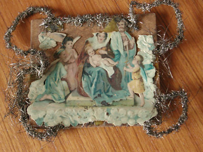 Title (ebay affiliate link): Antique German Tinsel Scrap Nativity Scene Christmas Ornament Vintage ca 1900