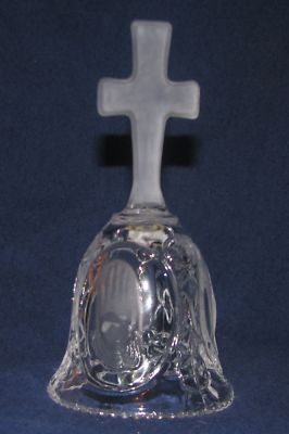Title (ebay affiliate link): Clear Glass Religious Bell - Praying Hands and Cross - Clear Glass Bell