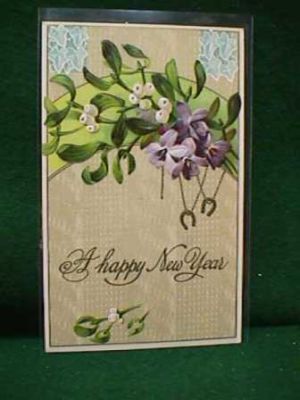Title (ebay affiliate link): Vintage New Year Postcard Mistletoe Violets and Two Gold Horseshoes on Chains