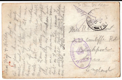 WW1 France to Cunliffe Rd., BLACKPOOL Train Field PO/ Censor