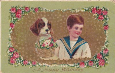 Title (ebay affiliate link): Antique Dog Lovers & Boy pretty Happy Birthday Roses Basket postcard