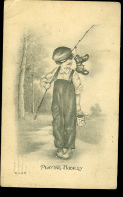 Title (ebay affiliate link): 1913-Little boy playing Hookey-Fishing pole & Barefoot & can of worms