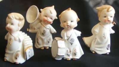 Title (ebay affiliate link): 4 Cute Vtg Japan Figurines w Musical Instruments Hummel Inspired Accordian Horn
