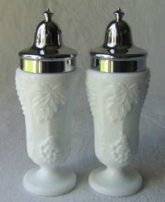 Title (ebay affiliate link): INDIANA MILK GLASS Harvest Grape Salt & Pepper S & P Set ** silvertone Lids