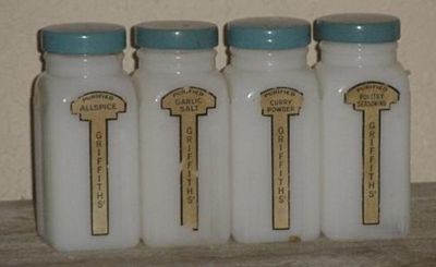 GRIFFITH'S 4 SPICE PURIFIED BOTTLE MILK GLASS BLUE CAP