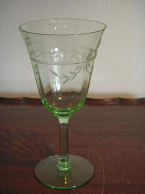 Title (ebay affiliate link): VINTAGE GREEN DEPRESSION GLASS Water / Wine ETCHED Floral pattern-VASELINE?