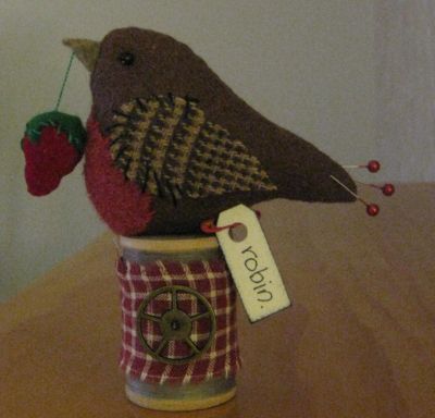 Title (ebay affiliate link): PRIMITIVE WOOL ROBIN BIRD STRAWBERRY SPOOL GEAR MAKE DO PIN CUSHION DOLL PFATT