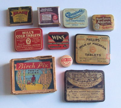 Advertising Apothecary tins boxes LOT exlax bayer drug store nostrums Old VTG