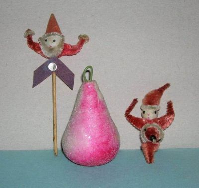 Title (ebay affiliate link): VTG Spun Cotton Sugar Pear Ornament Feather Tree Rose Pink/White + Elves