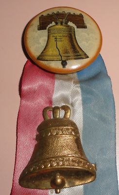 Title (ebay affiliate link): Vintage Liberty Bell Pin Back Celluloid & Brass Bells Pass & Stow