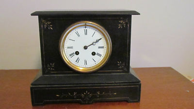 Title (ebay affiliate link): Antique black cement clock, unknown maker, floral scrolls on front