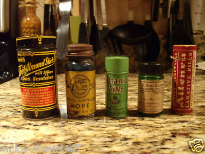 Title (ebay affiliate link): UNIQUE ANTIQUE LOT OF 5 CONTAINERS--MEDS, FURNITURE STICK, MODEL AIRPLANE GLUE..