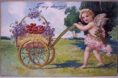 Title (ebay affiliate link): Postcard Valentine,To My Dearest,Cherub pushing cart full of flowers & hearts