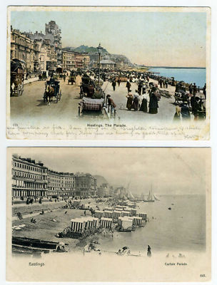 Title (ebay affiliate link): 2 old postcards of Hastings East Sussex 1903 bathing machines seafront