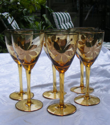 Vintage Amber Wine Stemware Glasses w/ Gold - Set of 6