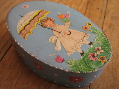 Title (ebay affiliate link): Small Vintage Hand Painted Oval Wooden Wood Box-Victorian Girl Parousel Flowers