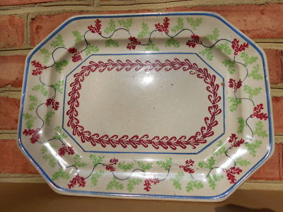Old Antique Spongeware Ironstone Elsmore Foster Platter Oak Leaves Red Grn Blue