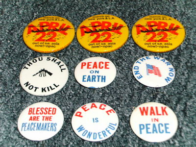 Title (ebay affiliate link): Lot of 10 vintage anti-war pinback buttons Vietnam 1972