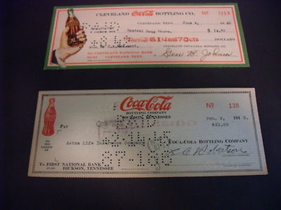 2 Paid COCA-COLA checks, 1945, 1942, Cleveland, Tn and Dickson, Tn very nice