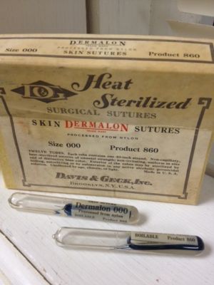 Title (ebay affiliate link): Antique Davis & Geck Skin Dermalon Sutures in 3 Glass Vials. Product 860