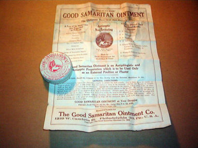vintage Good Samaritan Ointment medicine tin and advertisement