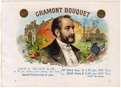 Title (ebay affiliate link): Louis E. Neuman & Co. Cigar Label, DUC de GRAMONT, Agenor