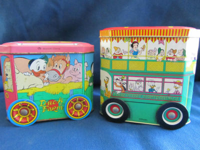 Title (ebay affiliate link): VINTAGE..DISNEY TINS..MADE in ENGLAND..2 TINS with WHEELS..EXCELLENT CONDITION!!